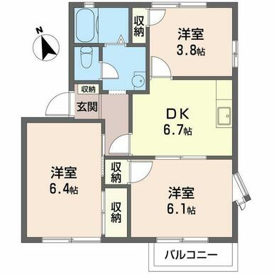 | 間取り | 3DK(DK6.7帖 洋室3.8帖 洋室6.4帖 洋室6.1帖) | 主要採光面 | 南 |